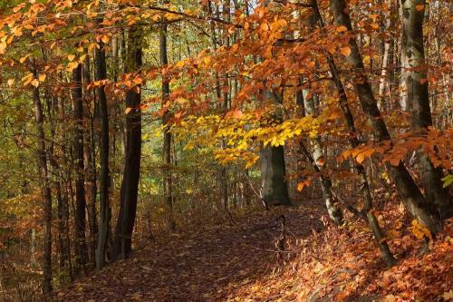 Waldlandschaft mit umgestürztem Baum, Stromschnelle und Wanderer